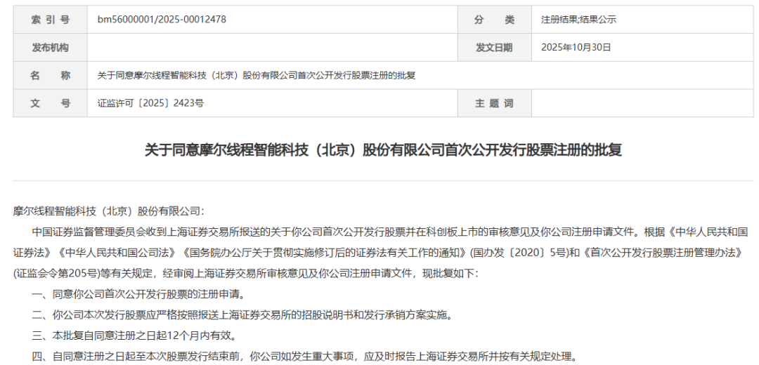 此前9月26日,摩尔线程首发申请通过上交所上市审核委员会会议审议。时隔一个月,IPO注册申请正式获批。